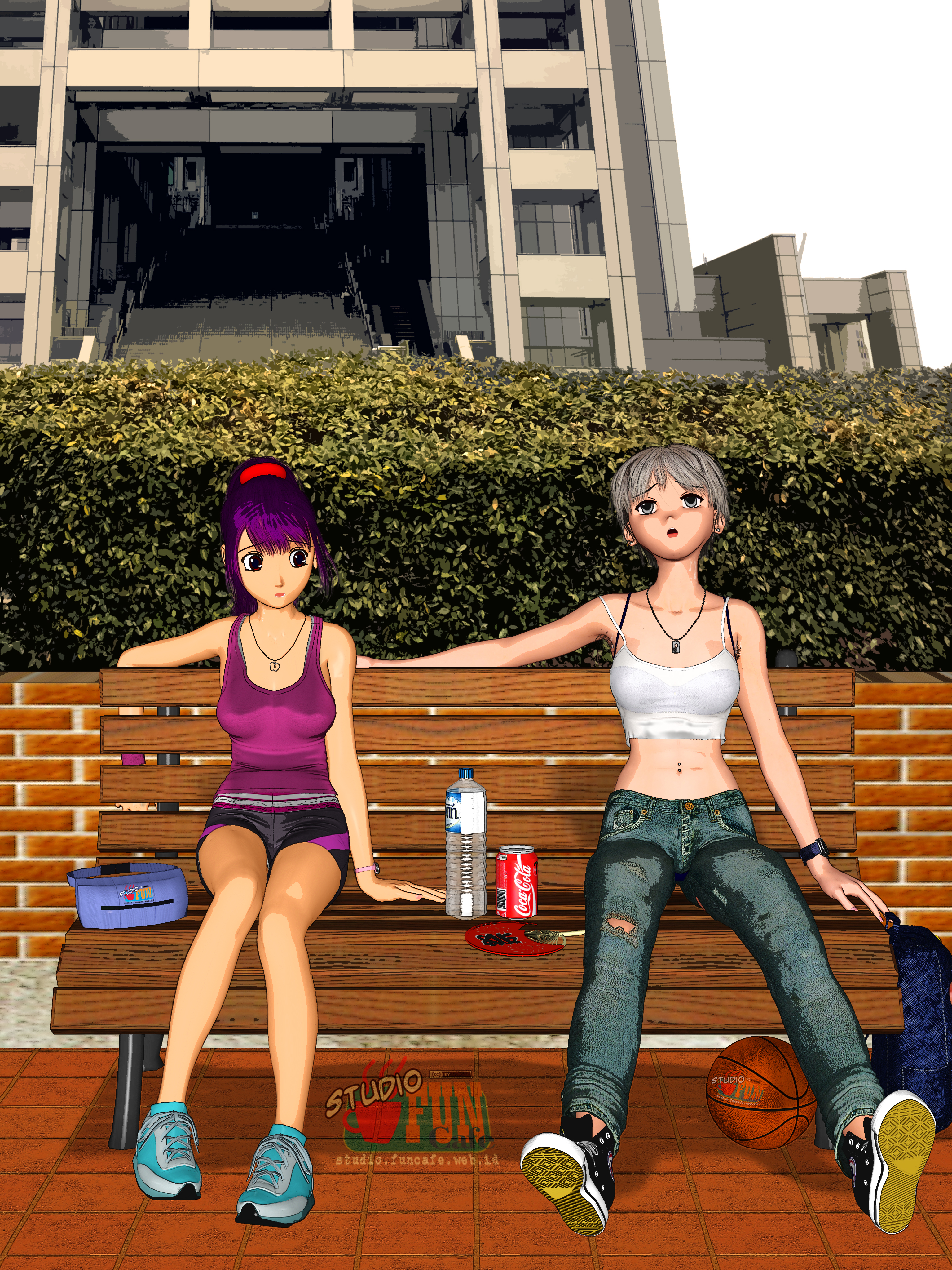 | Title: A Midsummer Hot Day Finished: July 14, 2025 During summer time, it gets really hot during the day. Still, summer still the great season to enjoy outdoor activities like running or playing basketball like our girls here. Since it's a hot day, they're taking a break to catch some breath and hydrating. Even on a hot day, it's fun to sweat every now and then. BTW, the location of the bench they're sitting on was real. I visited that place last year and I recreated it based on photograph I took back then. I'm sure you know where the location is since it's a famous spot. |