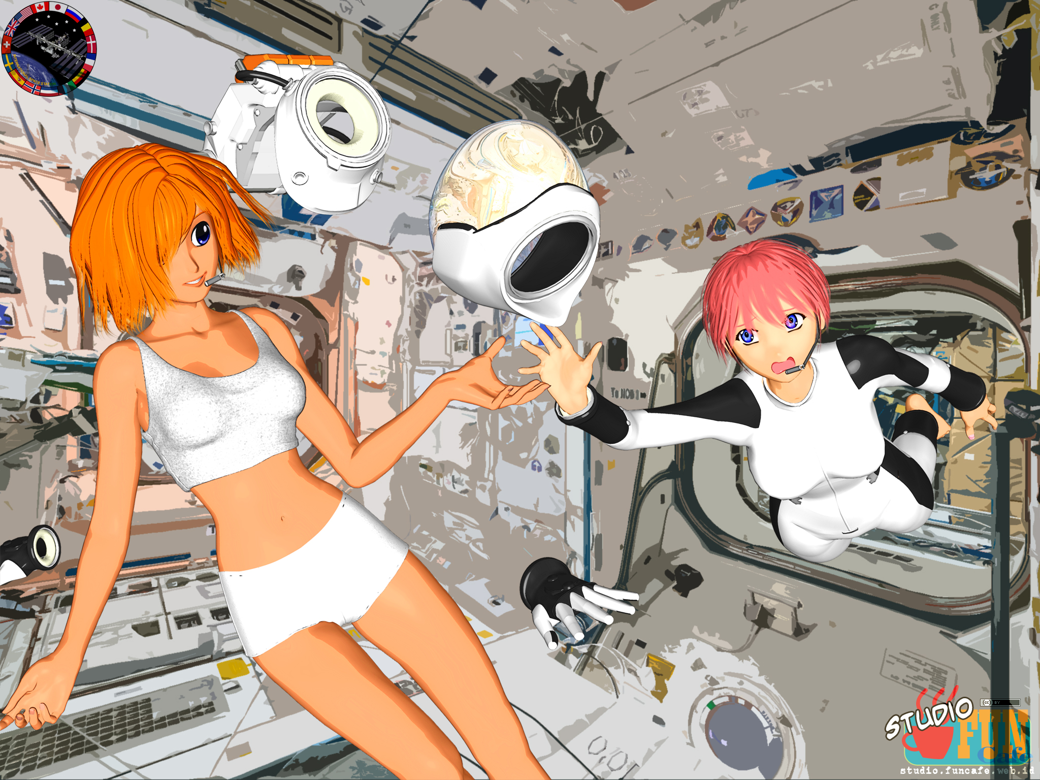| Title: Zero Gravity Cohabitation Finished: July 09, 2020 The second zero gravity scene. At initially, I put space suit on Rina and undergarment on Mai, but then I swapped it to match the scene. |