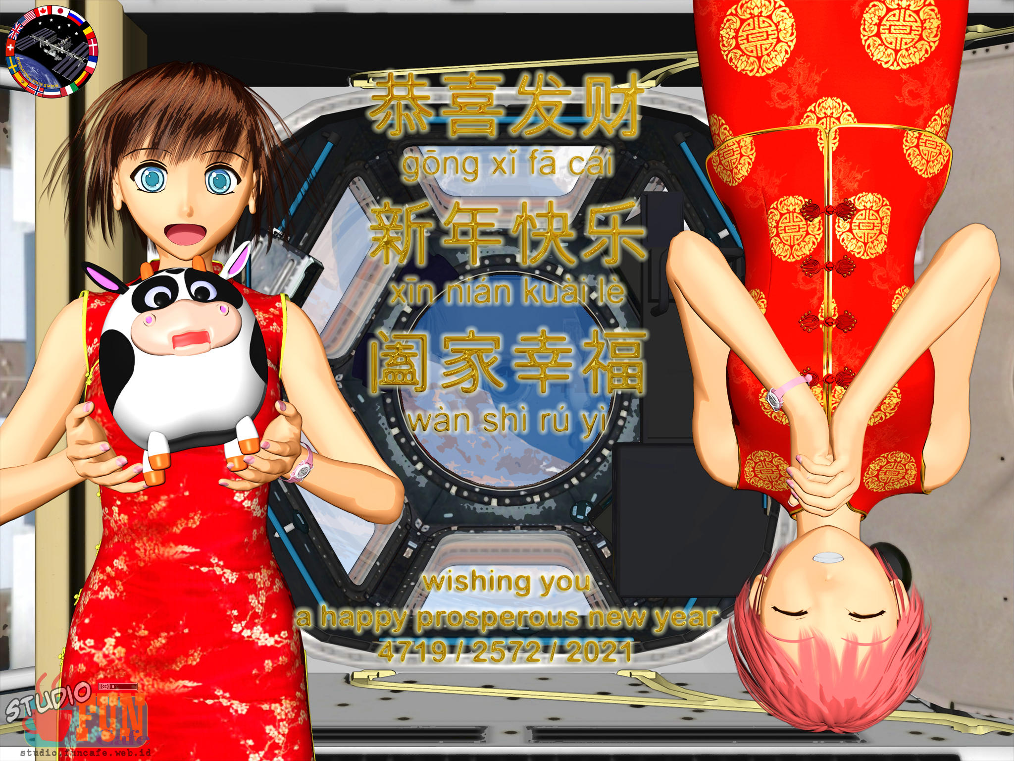 The 2021 Chinese New Year greeting card, featuring Rin & Mai in the ISS.