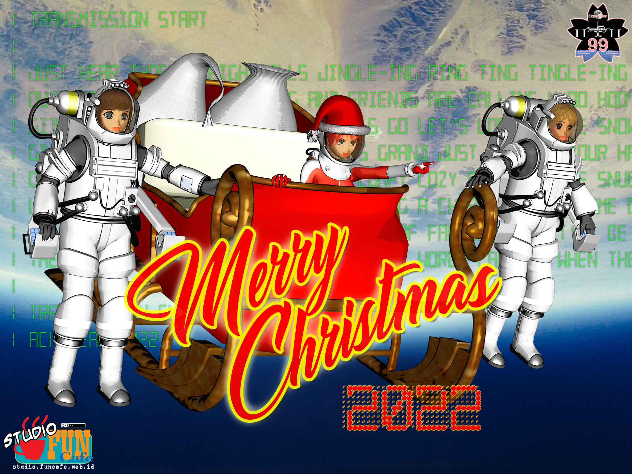 The 2022 Christmas card. The theme is: having fun with astronaut-powered sleigh.