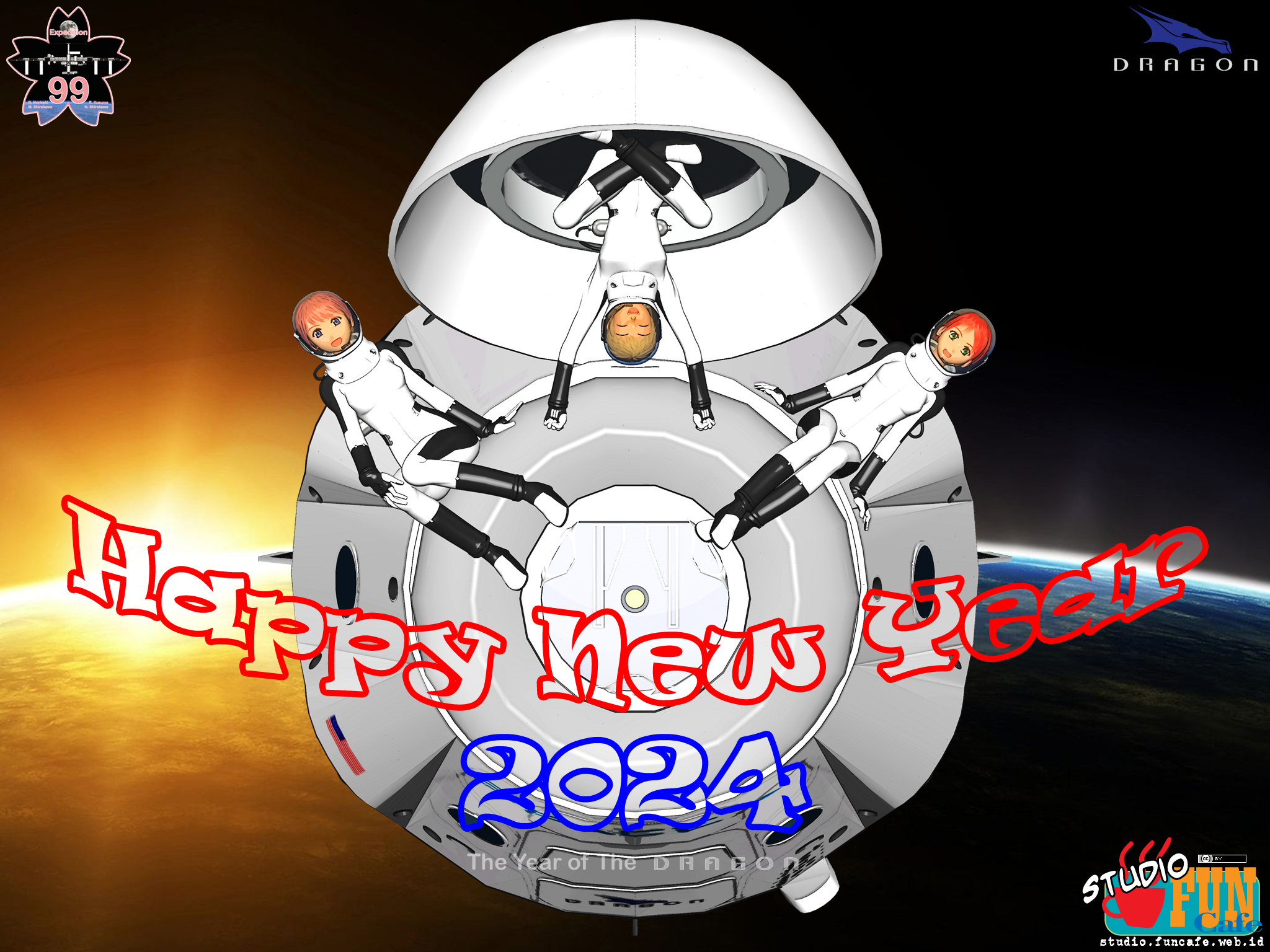 The 2024 New Year greeting card featuring Mai, Rina, Noa and SpaceX Dragon.