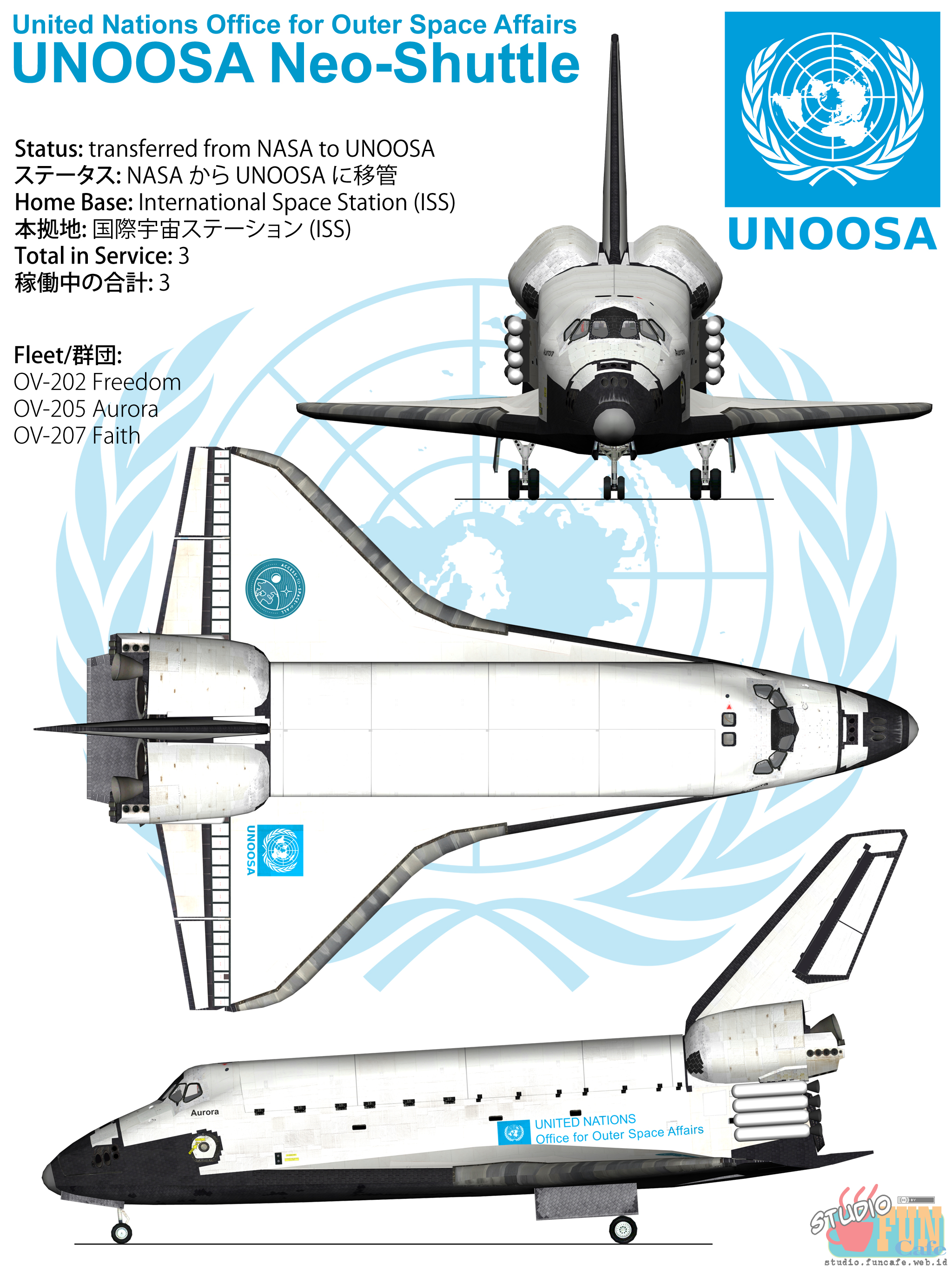 | Title: UNOOSA Neo-Shuttle Finished: January 28, 2024 In the (fictional) future, all cooperation between space agencies is being managed by UNOOSA (United Nations Office of Outer Space Affairs). The ISS and Lunar Gateway, as well as moon and Mars exploration is now being coordinated by UNOOSA. For that purpose, 3 units of NEO-Shuttle were transferred from NASA to UNOOSA and will be operated from ISS as their home base. This is the same Constitution-class Neo-Shuttle, only now operated by and having UNOOSA marking. |