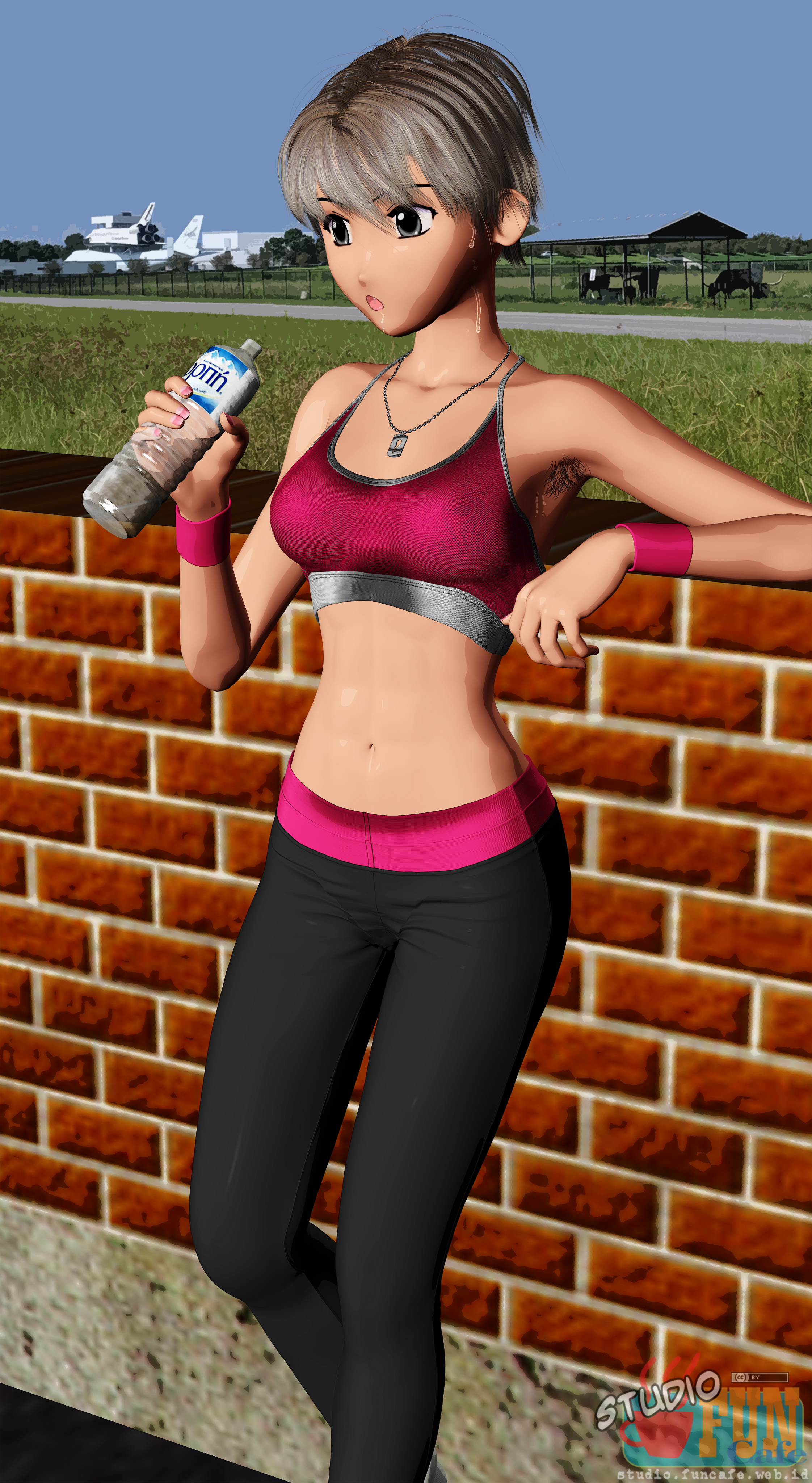 | Title: Taking a Break Finished: February 23, 2024 She loves running. That time I met her, she was taking a break during her daily run. She seems nice, but too bad I don't have a courage to ask her whether she's willing to share her drink with me or not. Drawing sweat is difficult, both on her body and on the clothes. That cause the inconsistent sweat location on these 3 pictures. |